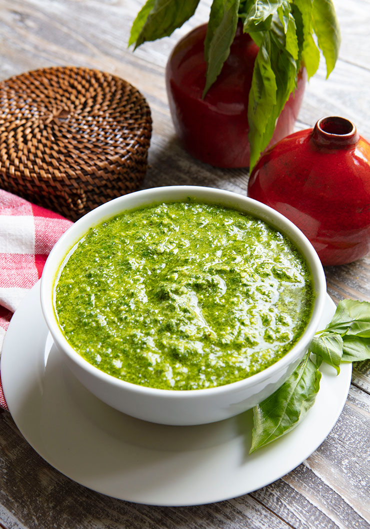 Traditionally, grated Parmesan cheese is added to the pesto, but I prefer the sharper flavor Pecorino Romano cheese. If you do plan on freezing your pesto though, skip the addition of the cheese until after you thaw out the pesto. I do not use the traditional motor and pestle either as I prefer the ease of a blender. I find that a blender works better to create a creamy sauce than a food processor does, but either will work just fine.