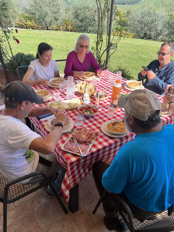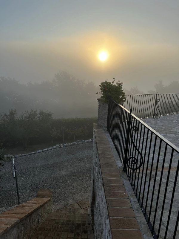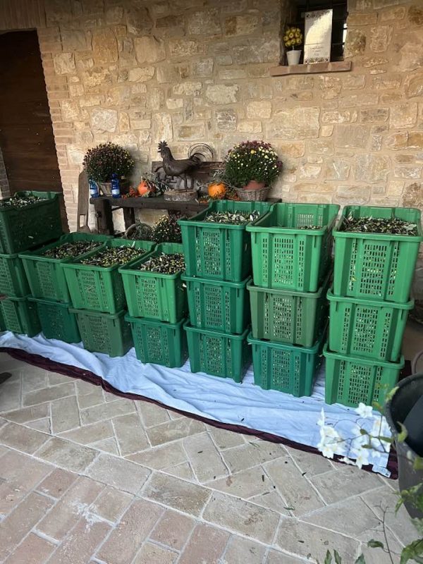 This year, we had lots of help harvesting our olives as family members traveled to Umbria from the US and Canada to give us a hand. It is good because we had a great year, with more olives than usual to pick. In addition, the weather couldn’t have been better for the harvest, with temperatures in the mid-seventies each day. It took us three days to pick all our olives, and although we had one foggy morning start, the other two days were perfect. After three days of hard work, we ended up with 2,000 pounds of olives, just under 100 liters after they were pressed at the mill. The oil was especially tasty this year, and our neighboring farms were also happy with the quantity and quality of this year’s olives.