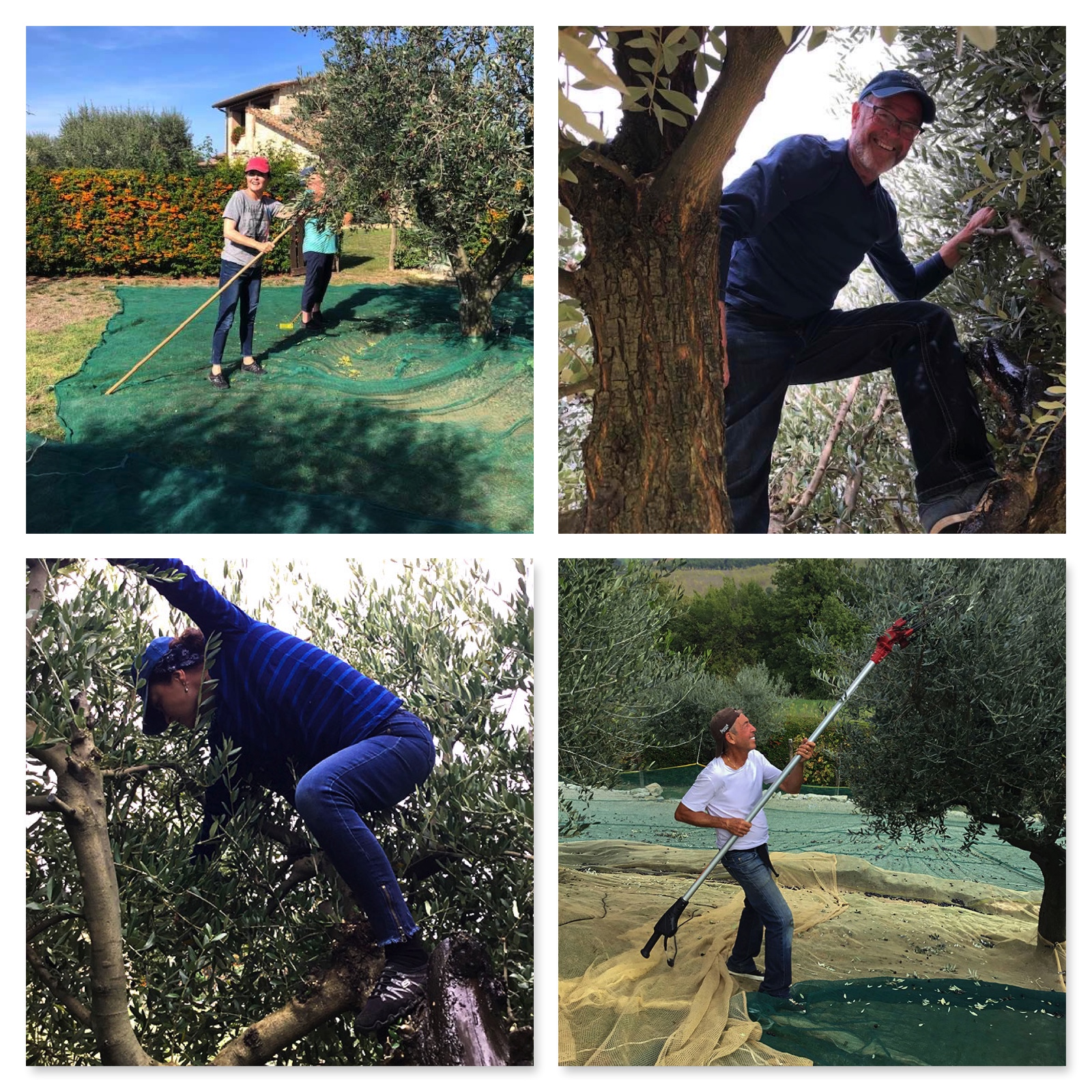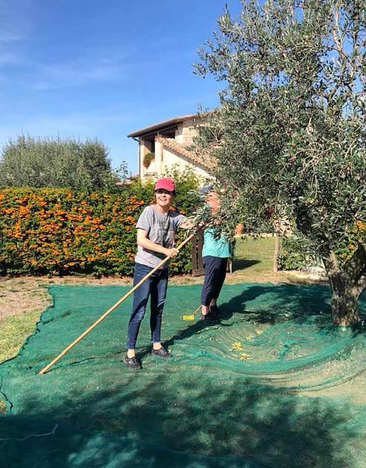 We harvest the olives by hand with rakes, with a branch shaking apparatus that shakes the olives off of the branches, and then we even crawl into the trees to ensure all of the olives within the trees have been picked. Both Linda and Mike were good sports climbing the olive trees!