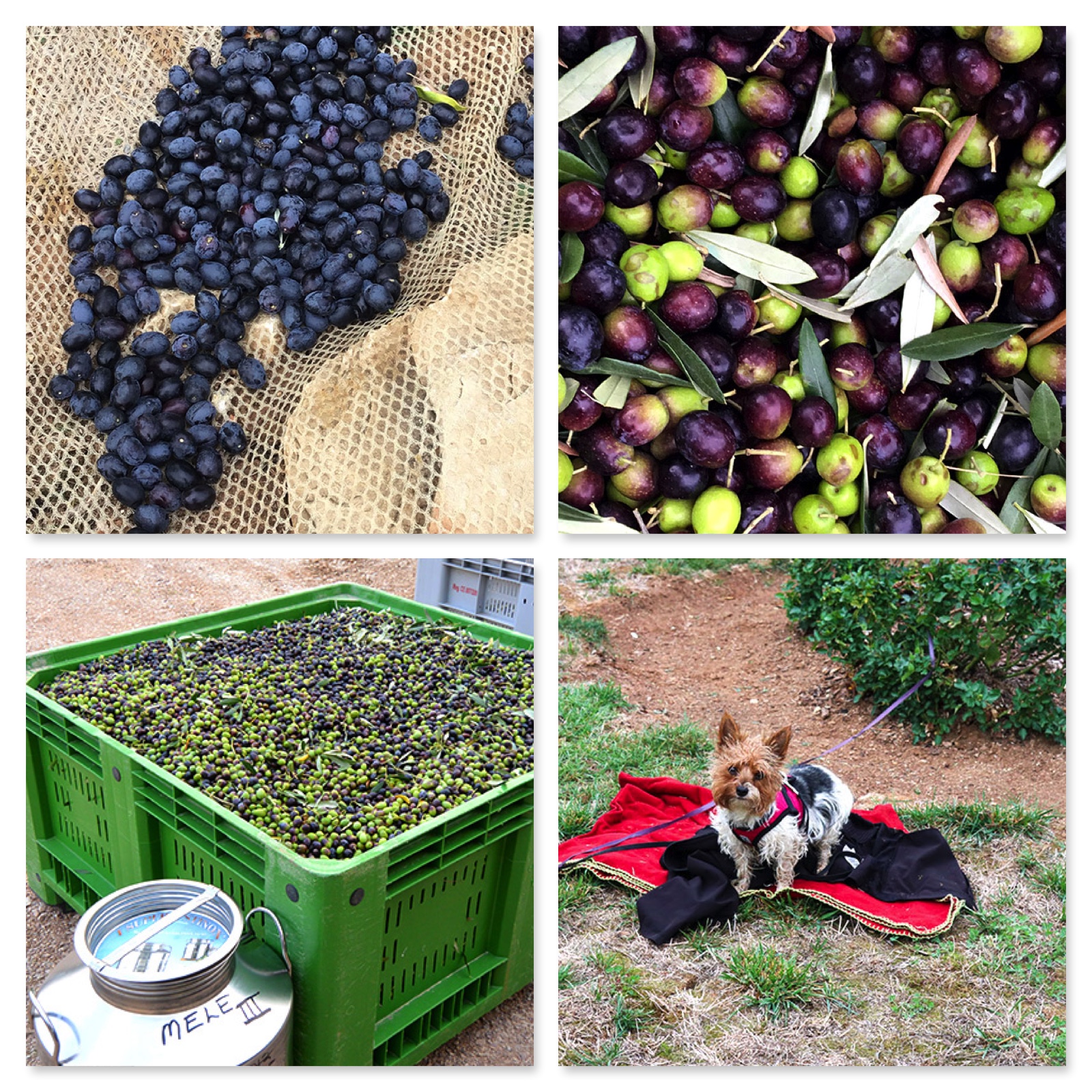 We have three types of olives growing on our property which creates a full-flavored olive oil when mixed. Even our little dog Zoe was taking part in the harvest this year!