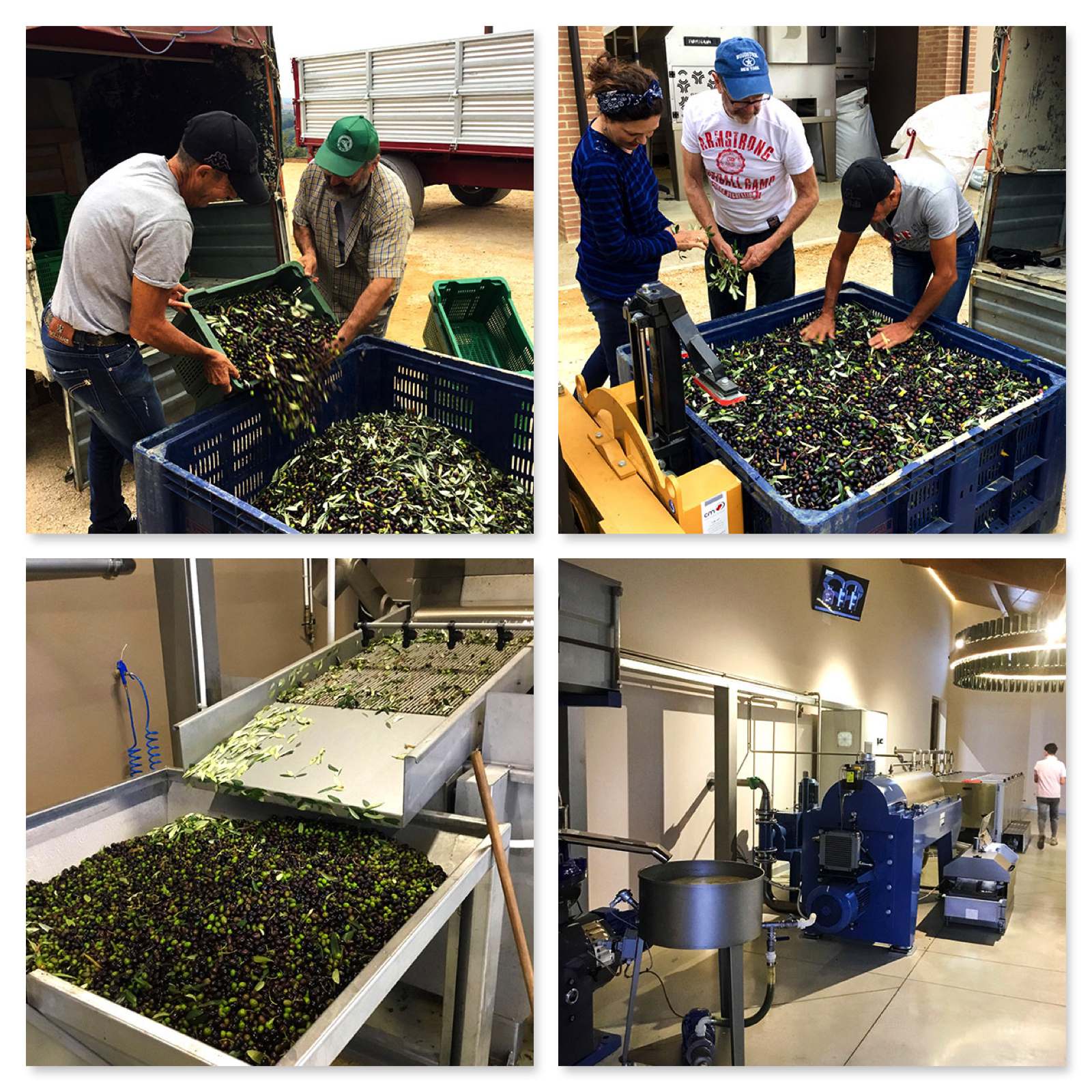Taking the olives to Frantoio Fratini to start the pressing process. The olives are first dropped into large vats where they are separated from leaves and small branches, then they are washed before moving into the mill to be crushed and the oil to be extracted.