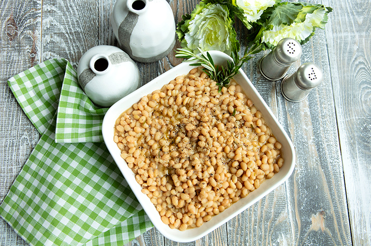 I do add a fresh herb, rosemary being one of my favorites for white beans. I cover the beans with water, bring the water to a boil, then reduce to a simmer and cook until tender. The timing may take anywhere from half an hour to two hours depending on the type of bean you are cooking, and how old it is, so it is best to taste a bean every so often to check. When cooked properly the bean should be tender, not mushy…..basically still requiring teeth to chew them!