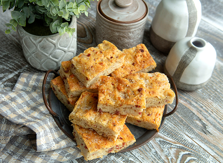 Tender slices of focaccia are studded with salami and cheese.