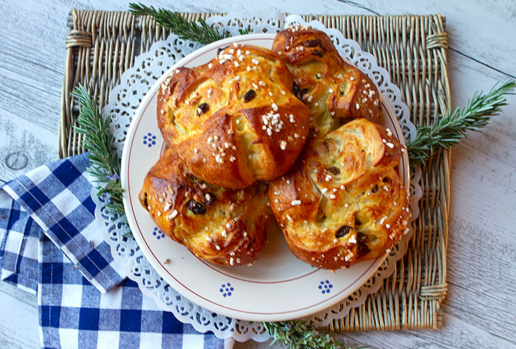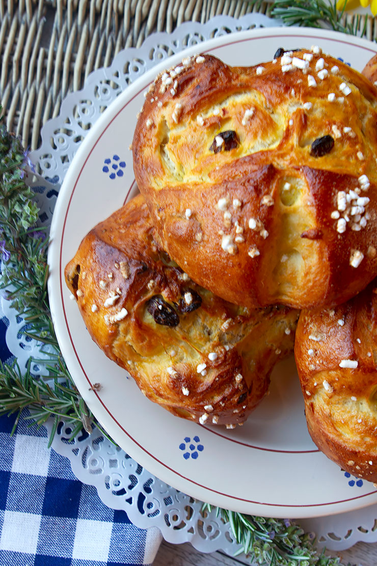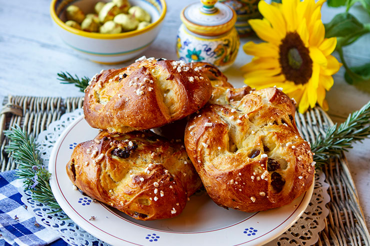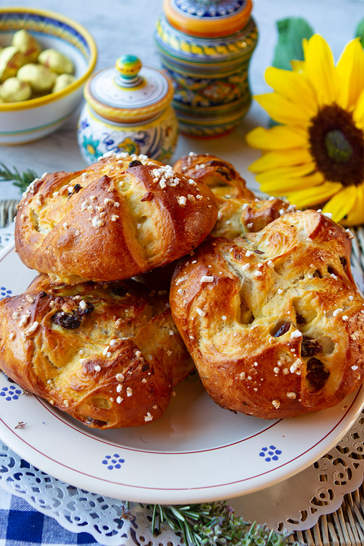 Lightly flavored with rosemary and raisins, these not too sweet Easter buns are a specialty in Tuscany.