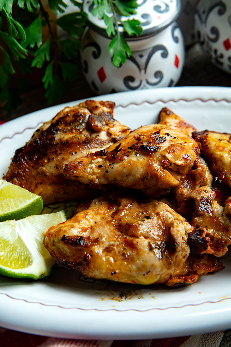 This easy marinade uses my Calabrian chili pepper pesto and fresh limes, garlic, and olive oil. The limes help to tenderize the chicken and add brightness, while the chili pepper pesto adds a gentle heat. I order from Calabrian chili pesto from Amazon.com and always have a few jars in my pantry. You could use chicken breasts in place of chicken thighs, however I find that the thighs work really well with this marinade.