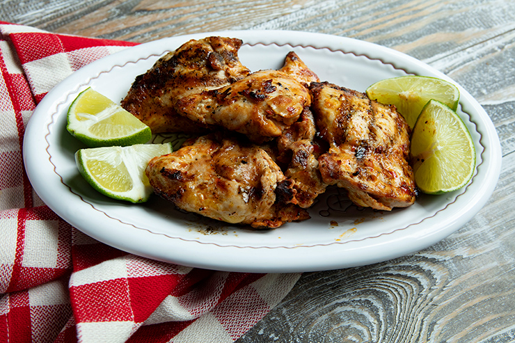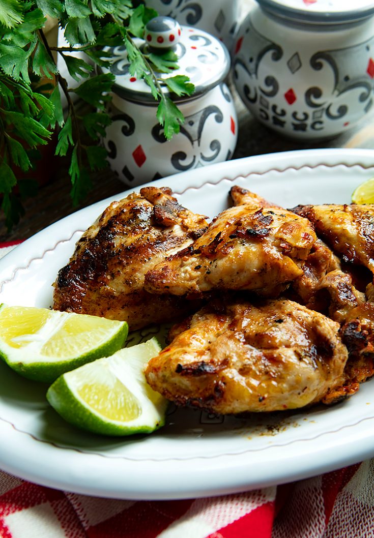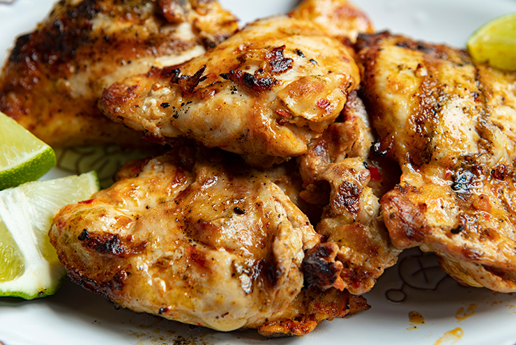 Tender, spicy marinaded chicken thighs are grilled until golden brown in this easy recipe.