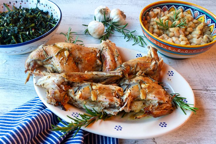 Fresh rabbit isn’t always easy to find here in North America. Still, in Umbria, Italy, where we live part of every year, it can be found in almost every grocery store. This rabbit is very tender and moist, and since rabbit is very lean and can be tough if not prepared carefully, this has become my favorite way to cook it. I serve the rabbit with tender white beans, or oven-roasted potatoes and sautéed greens.