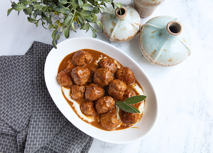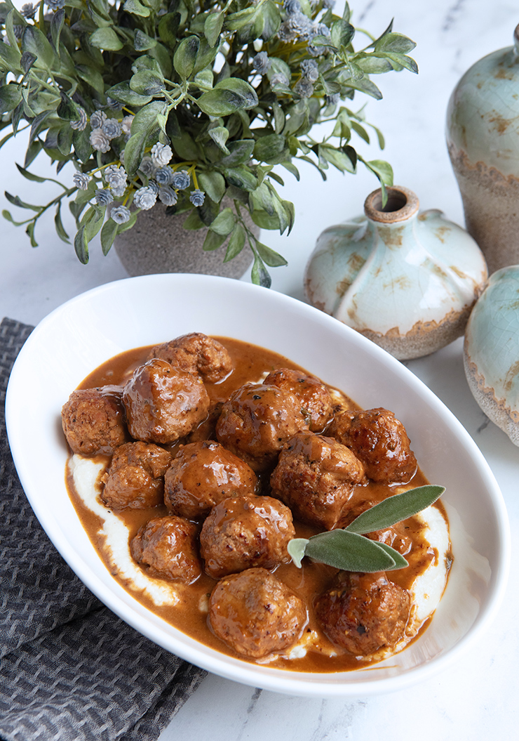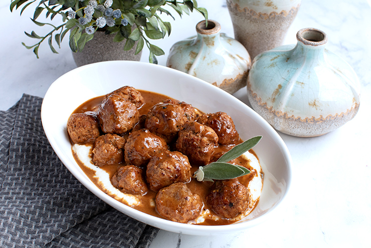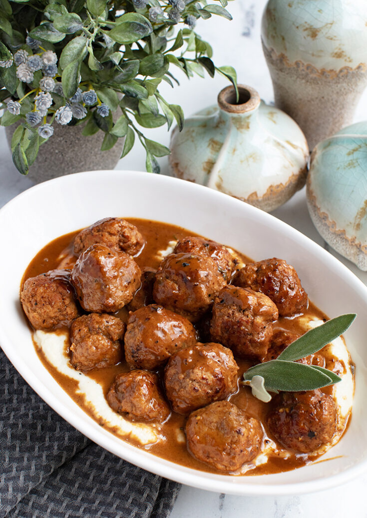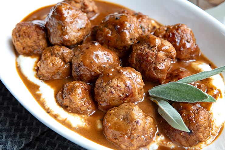 - Serve the meatballs with the sauce spooned over the top, and garnish with fresh sage.