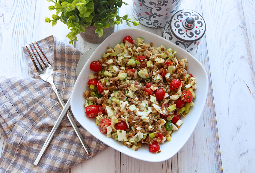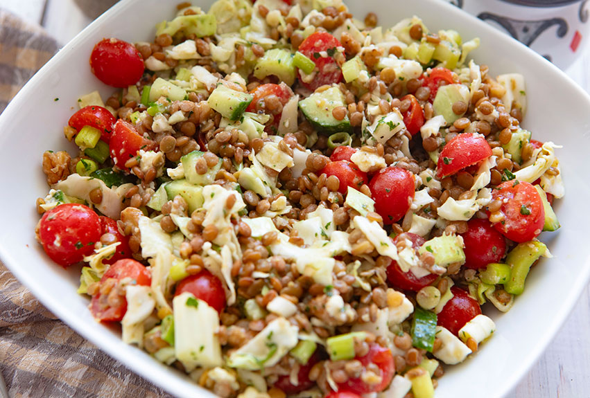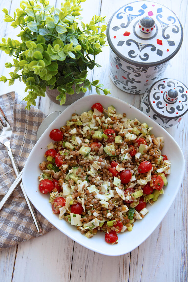 When lentils are done, strain and add to a large serving bowl with cabbage, tomatoes, cucumbers, and green onions.