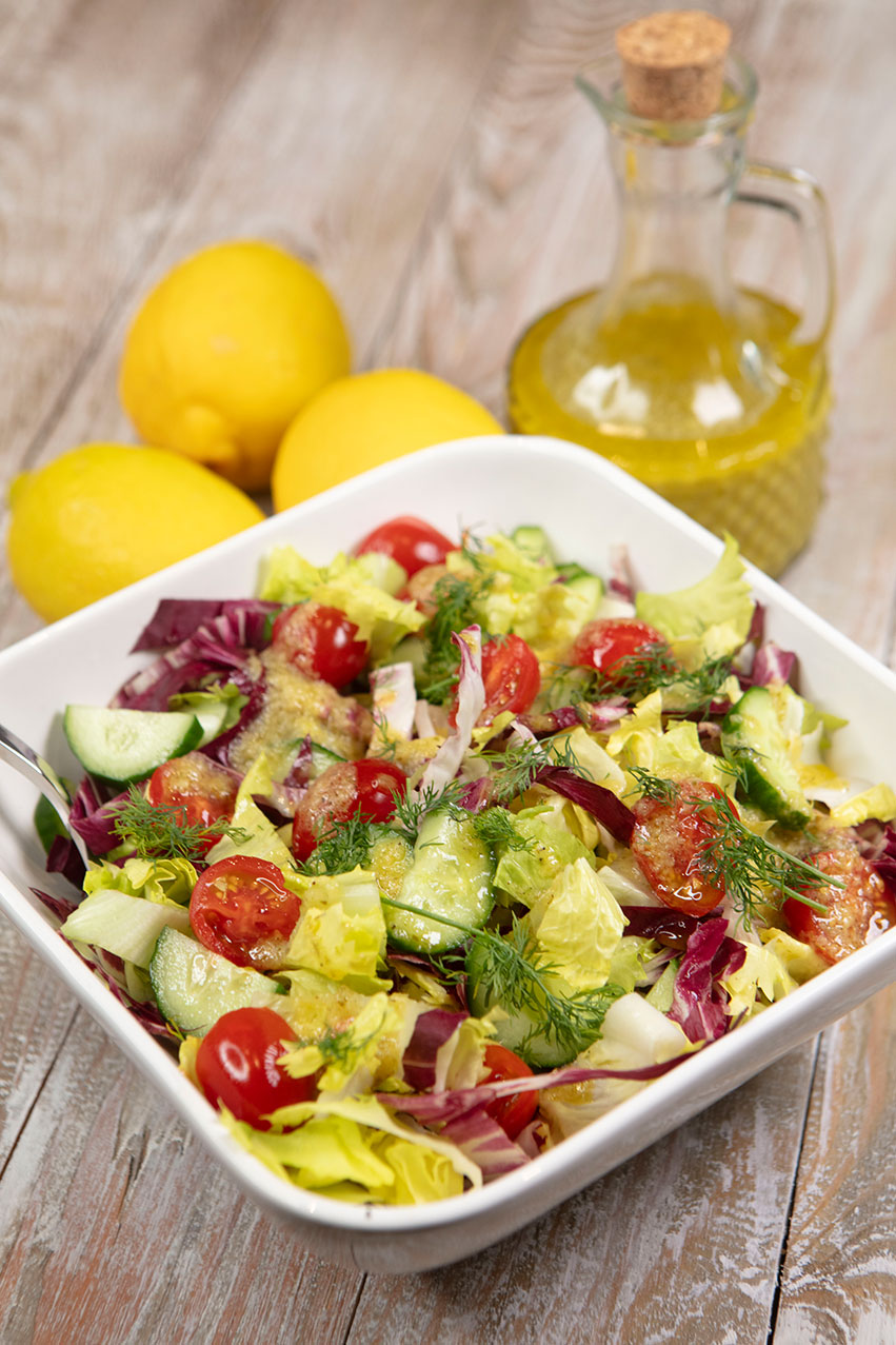 You can use any fresh herbs you prefer in this dressing. I used dill and chives, but mint, parsley, and basil are also good choices. Wash the lemons thoroughly before use, and opt for a high-quality extra-virgin olive oil. I used our own oil that we harvest every fall at our Umbrian farmhouse, so my dressing is quite green. If you use a lighter oil, your vinaigrette will also be lighter. I love the vibrancy of this vinaigrette, but if you find it too “lemony,” you can add a spoonful of honey to the dressing to tame it just a tad.