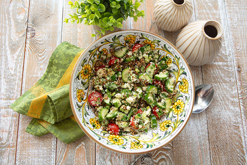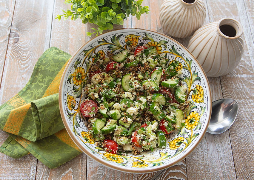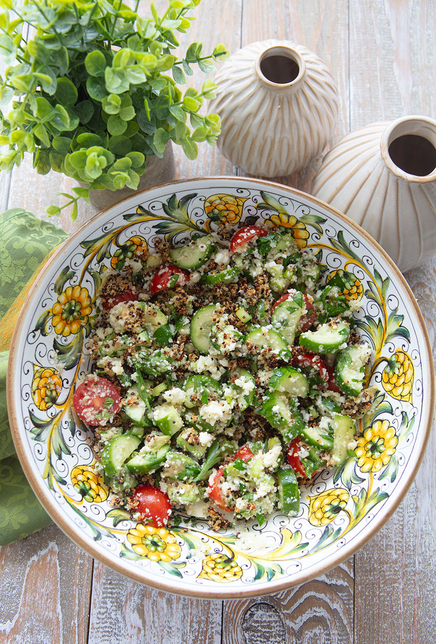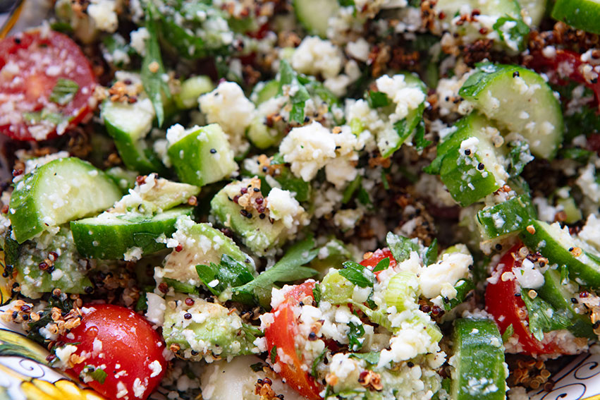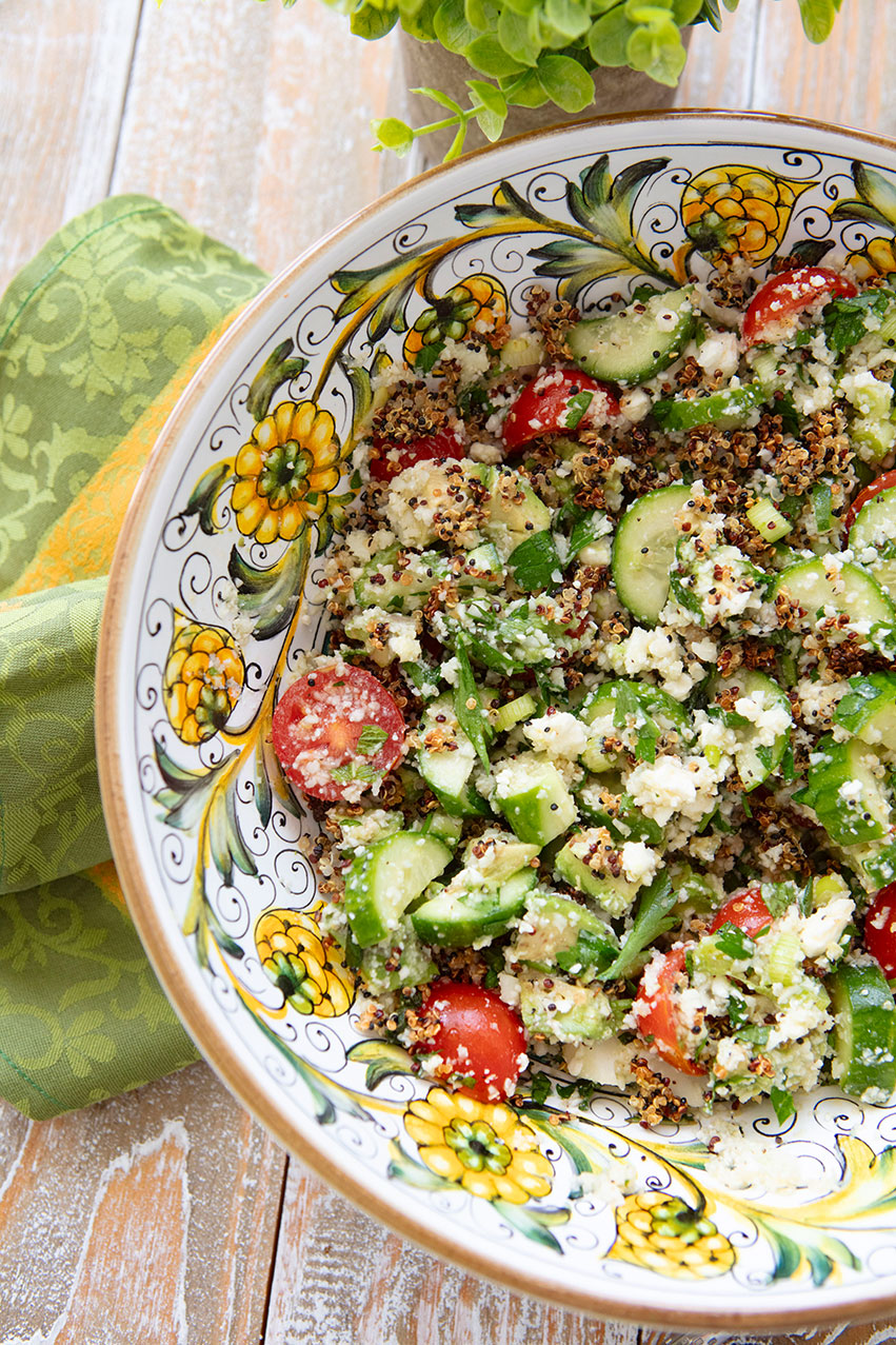 This salad is so refreshing on a warm day that I have been making it on repeat recently as our temperatures have been rising here in Florida. It has a Greek salad influence, but the crispy quinoa, avocado, and cauliflower rice give it a new texture and flavor. I had quinoa in my pantry, so I used it, but you could use rice (brown rice is preferred) or even farro instead.