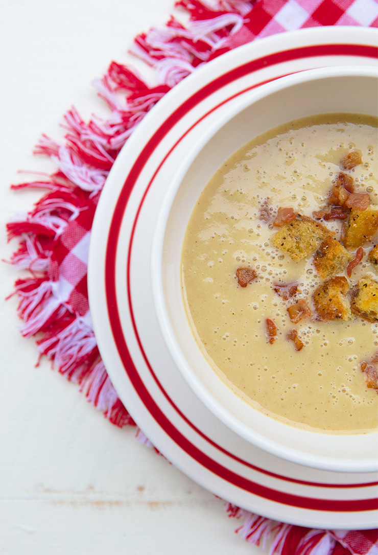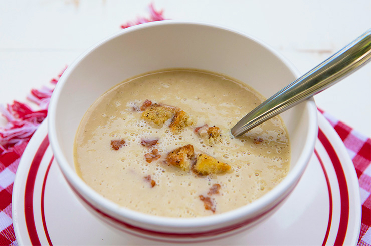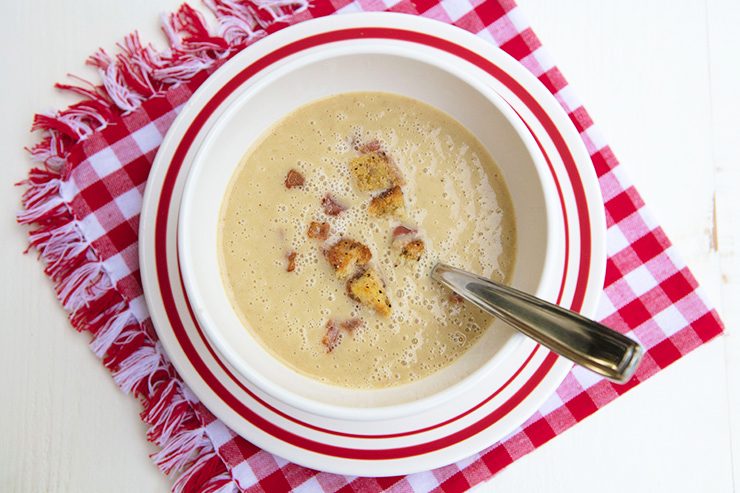 I served my soup garnished with some homemade whole wheat croutons and some bacon bits and thoroughly enjoyed every single spoonful. The soup was rich and smooth and full of flavor. Although the roasting of the garlic creates a sweeter garlic flavor, this soup still tastes of garlic, so garlic haters beware.