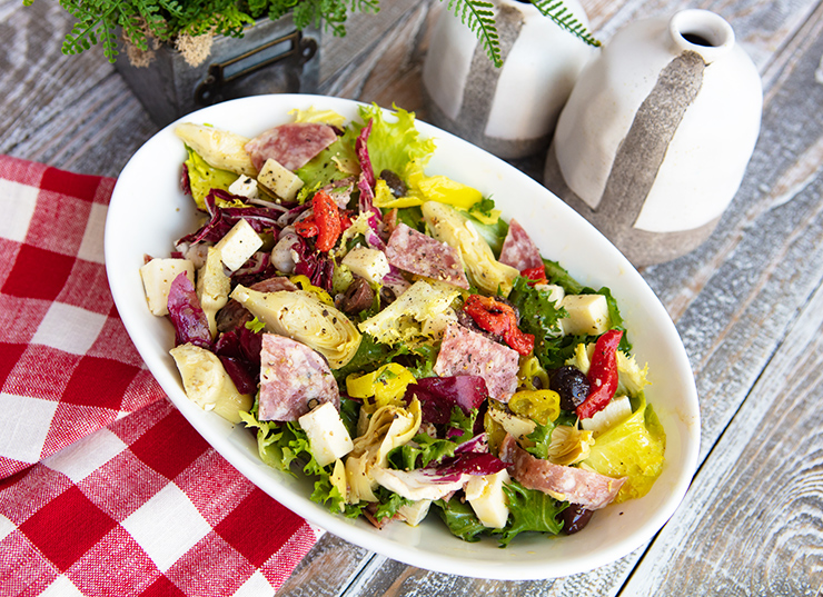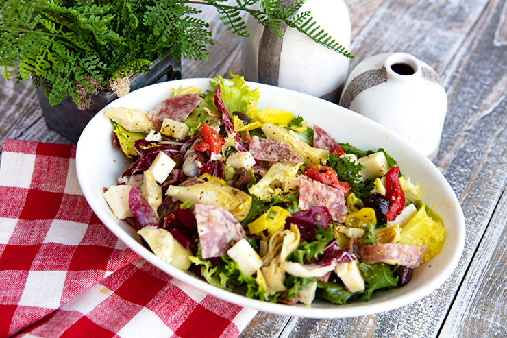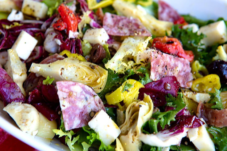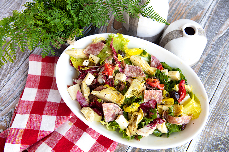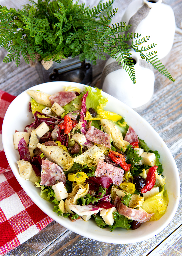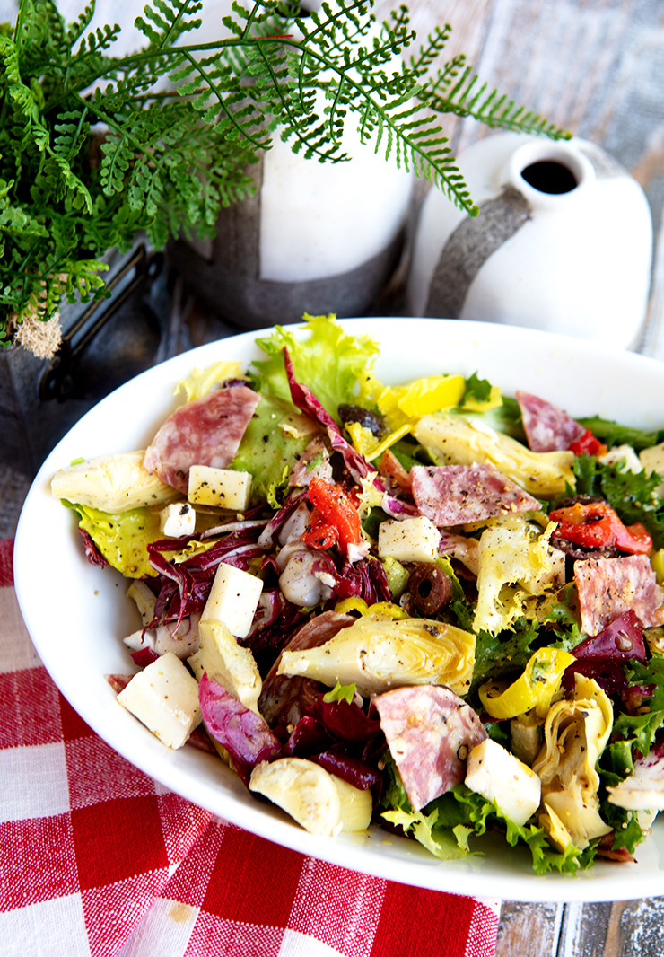 When entertaining friends and family during the warmer weather, I often like to serve this antipasto salad as a first course. For me, this salad should have a mix of greens, including bitter lettuces such as radicchio and escarole. Romaine lettuce is also a common green used in this salad.
