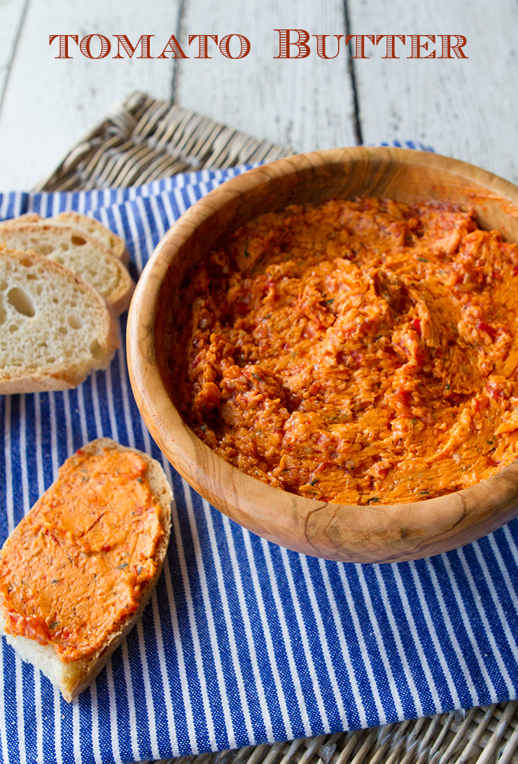 Although I adore fresh, ripe tomatoes, I do get a little tired of trying to turn them into soups and sauces on a daily basis. Looking for inspiration for something new from the internet, I came across a recipe for tomato butter. Although I have made compound butters in the past, they were usually created to top grilled meat and included fresh herbs and garlic.