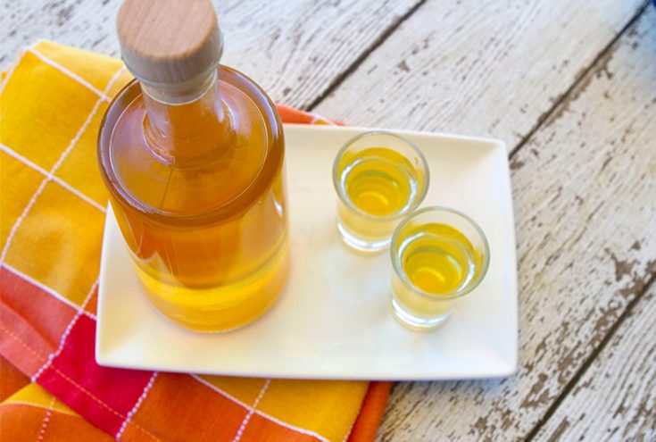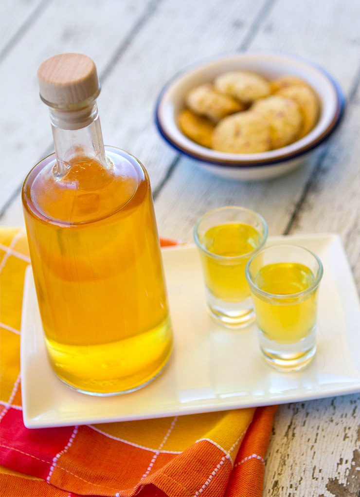 I made this apricot liqueur last spring, and it turned out so well that I am making it once more this year. It is not too sweet, and by combining both dried and fresh apricots, the fruit flavor is very pronounced. This is one of the easiest liqueurs to make as you place the fruit in a jar, cover with vodka, and place it in a dark place for a week or so allowing the fruit to infuse the vodka. You then strain the mixture and add in a little simple syrup, and you are finished.