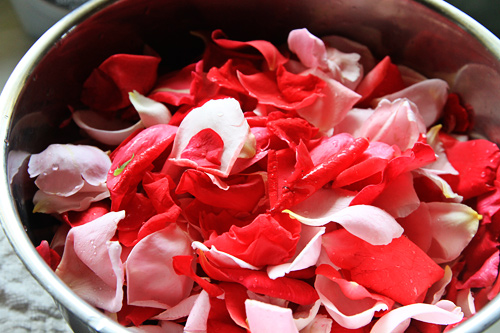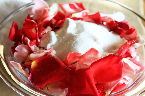 - Place the rose petals into a non-reactive bowl and toss with 2 cups of the sugar and rub gently with your fingertips, squeezing the petals gently to bruise slightly.