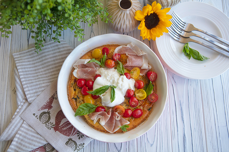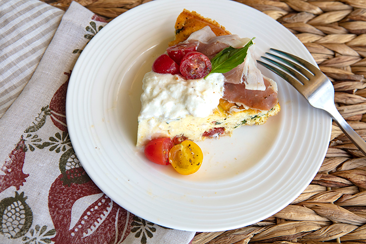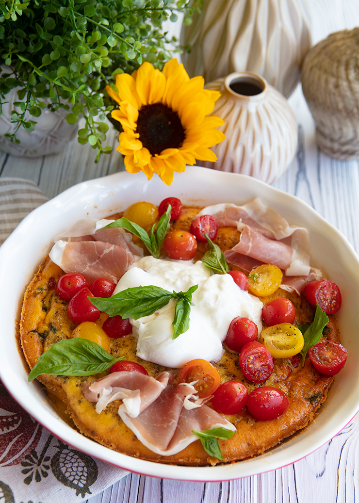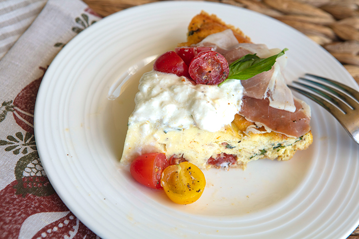 This version combines tomatoes, mozzarella, and chopped basil within the egg dish. Just before serving, I top the frittata with some dressed halved cherry tomatoes, slices of prosciutto, and some creamy burrata. This frittata is as attractive to serve as it is delicious, so it is an excellent option for a family brunch or special holiday breakfast.
