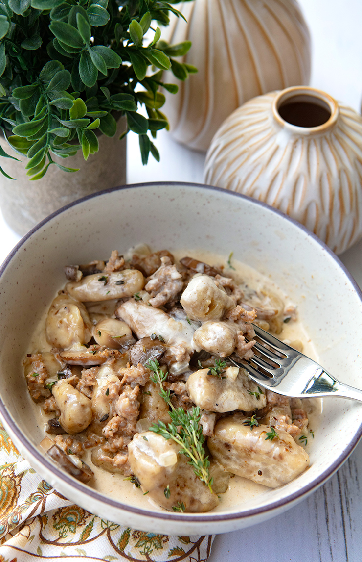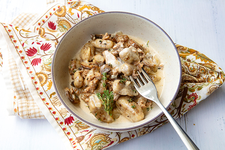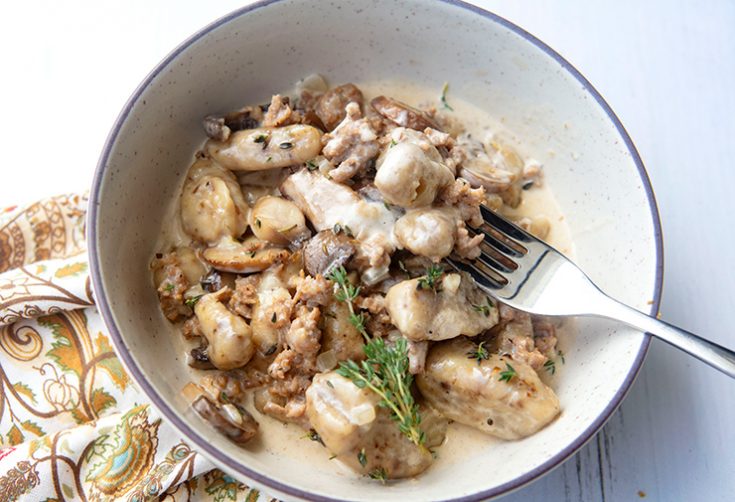 A tender bowl of gnocchi bathed in a creamy sauce of mushrooms and sausage.