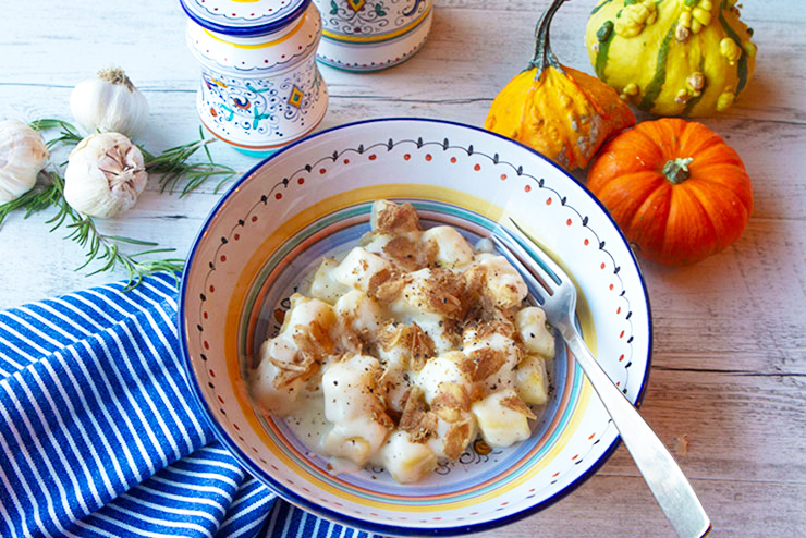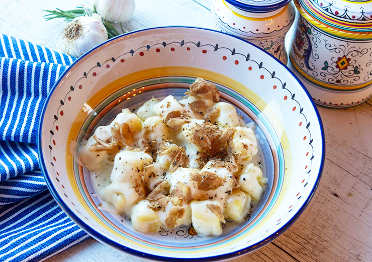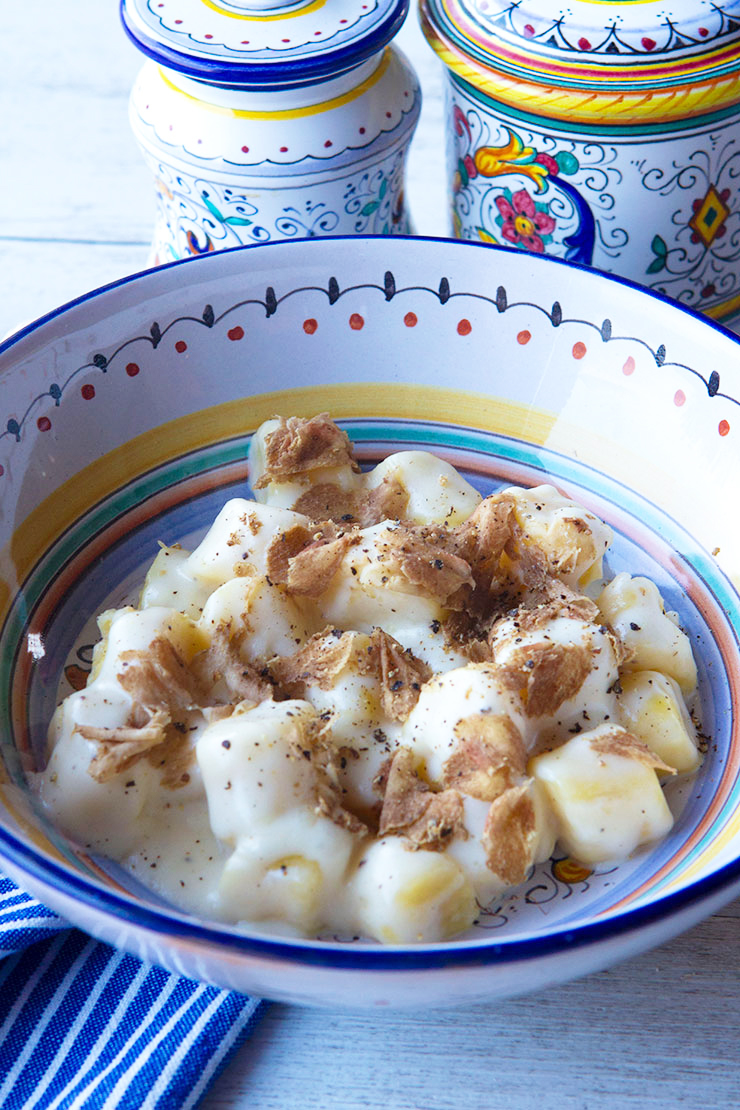 Light, pillowy potato gnocchi is topped with a truffle flavored cheese sauce in this Umbrian recipe.