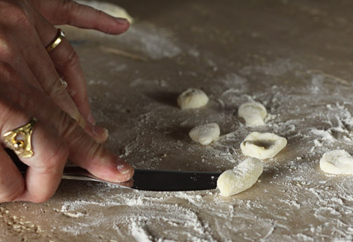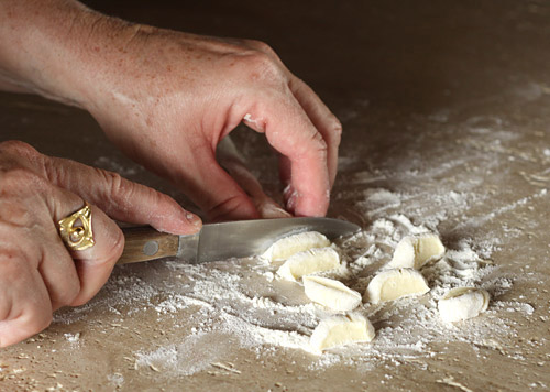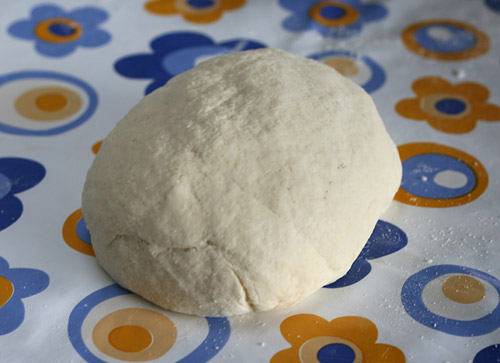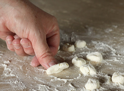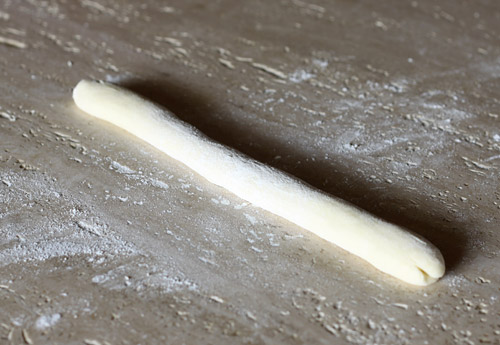 Take the dough from the refrigerator and break off a small plum sized ball. Using a well floured textured surface, roll the ball into a tube about 1/2 to 3/4 of an inch thick.