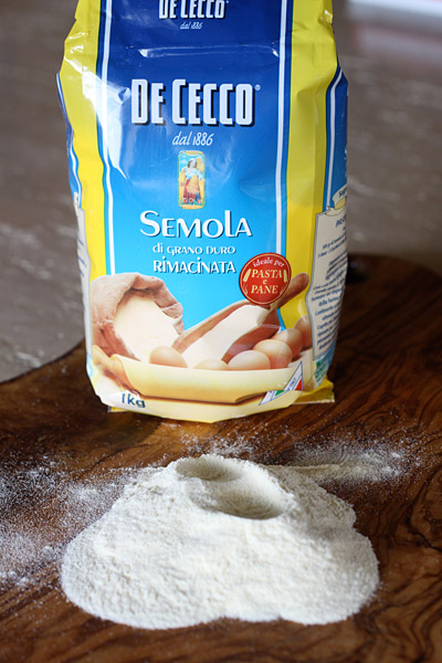 Mix together two parts semolina flour with one part all-purpose flour and add just enough warm water to make a smooth dough. Knead for 10 to 15 minutes on a lightly floured surface until the dough is very smooth and stiff. Wrap in plastic and refrigerate for a minimum of two hours.