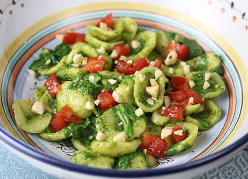 A perfect orecchiette is about 3/4 of an inch across and slightly domed shaped which enables them to hold pasta sauce well. The method used to make them creates centers that are thinner than their rims, a characteristic that gives them an interestingly texture, soft in the middle and somewhat more chewy outside when cooked “al dente”.