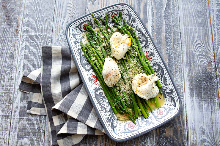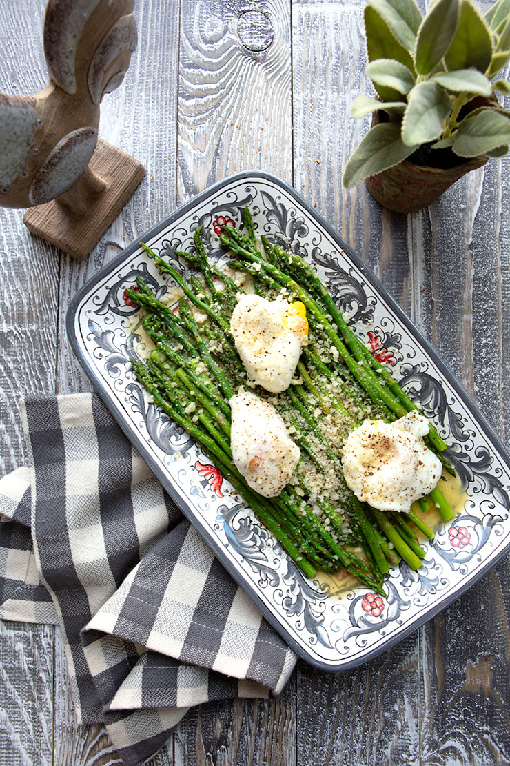 Serve this dish with some toasted bread to sop up the tasty yolk and juices. You can either fry the eggs in some butter, or use olive oil as my husband prefers. I like to poach my eggs, but just make sure that the yolks are still runny as they bathe the asparagus in eggy goodness.