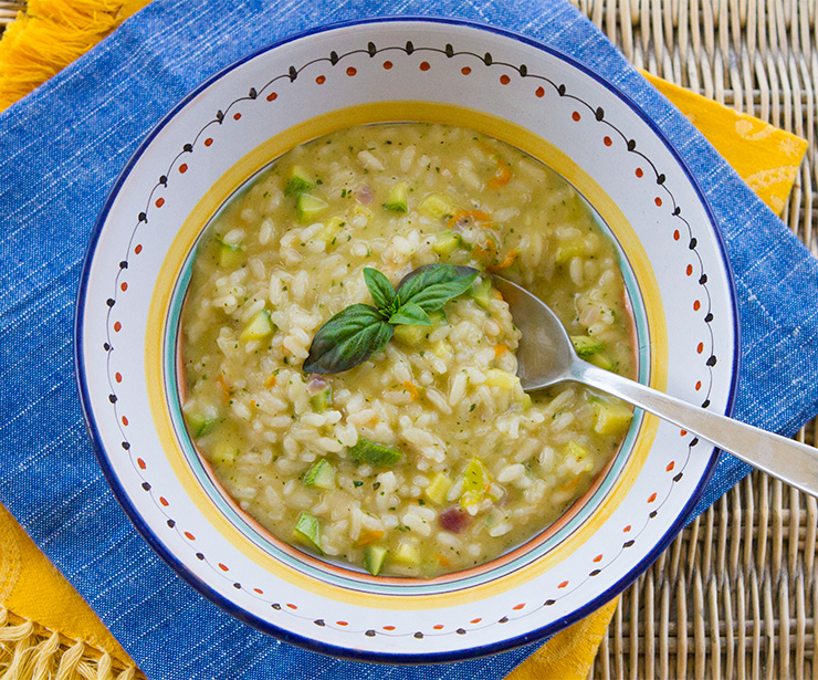 I am constantly picking basil before it flowers and often make a batch of pesto to garnish a bowl of soup, to toss with hot pasta, or to stir into a risotto dish such as this one. If you do not have a supply of fresh basil on hand, you could use a good quality store brand pesto instead.