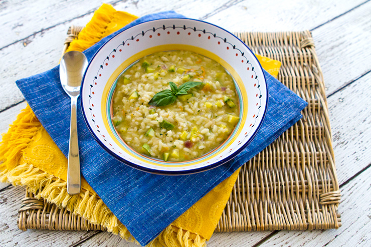 I recently made this creamy risotto using up some small, locally grown zucchini and zucchini flowers. I also added a spoonful of basil pesto made fresh from my garden that really added a bright note to this dish. We’ve planted basil in pots all over our property and for some reason basil grows like a weed in these pots but doesn’t want to grow in the garden.
