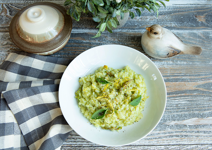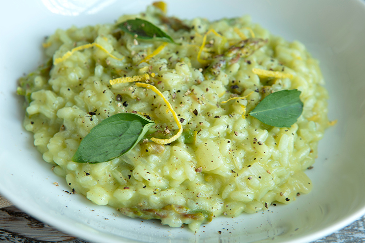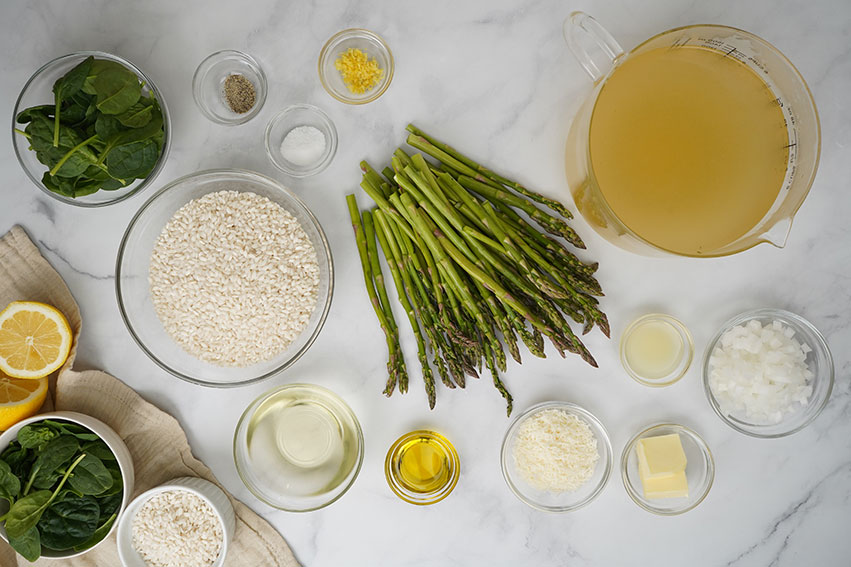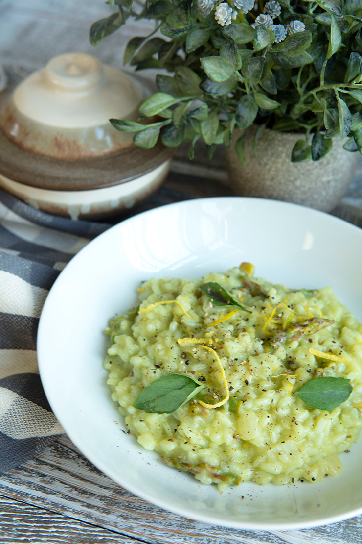 This risotto is flavored with fresh asparagus and lemon, giving it a bright, vibrant flavor. For this dish, I like to make a puree or pesto with some blanched asparagus that I stir into the rice dish during the last few minutes. This helps keep the asparagus flavor fresh tasting and gives the dish a pretty green color. Garnish the finished dish with a few blanched asparagus tops and some fresh lemon threads.