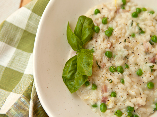Creamy risotto studded with fresh spring peas and ham.