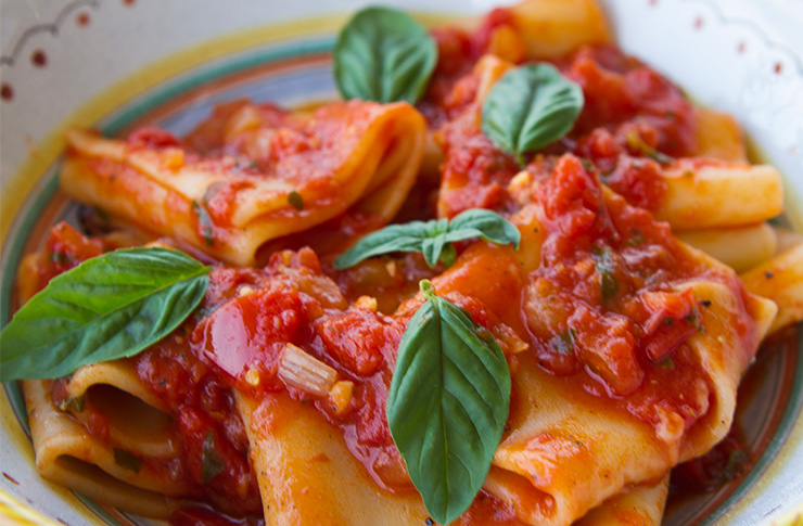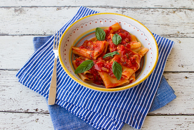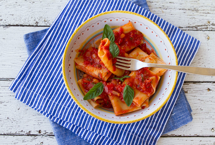 Since most of us can buy decent cherry tomatoes year-round, this is undoubtedly a sauce I’ll often be making. I chose to use paccheri, a thick tube type of pasta shape that works well with chunky sauce, although you could use just about any pasta shape with this sauce. For best results, do use good quality canned San Marzano tomatoes and fresh basil.