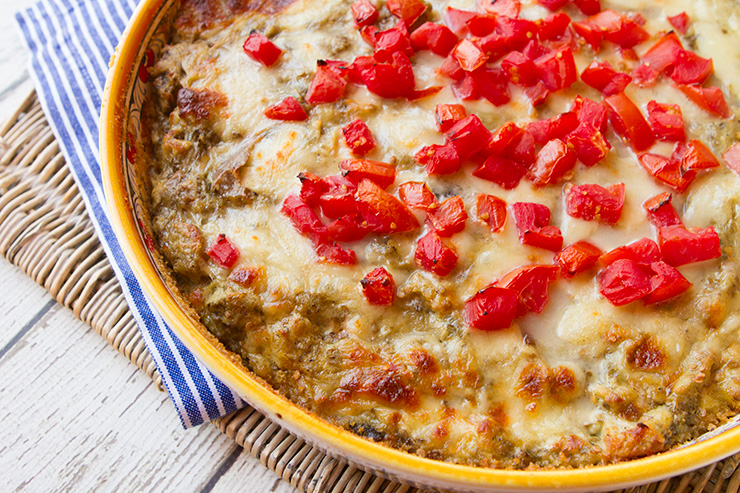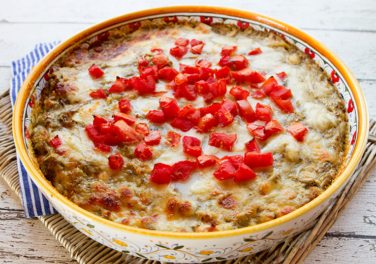 - Spoon the tomatoes into the center of the sformato, then bake for 35 to 40 minutes until the sformato is set, and the cheese is bubbly and beginning to brown. Rest 10 to 15 minutes before serving.