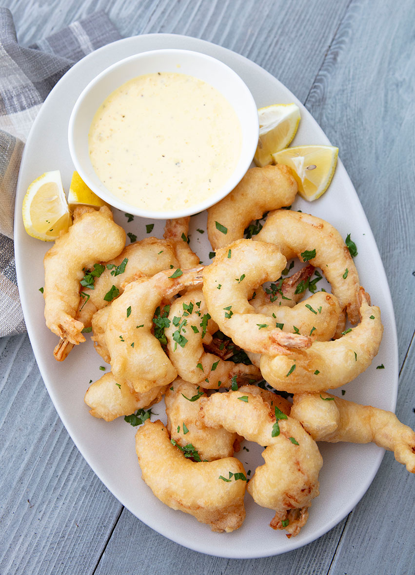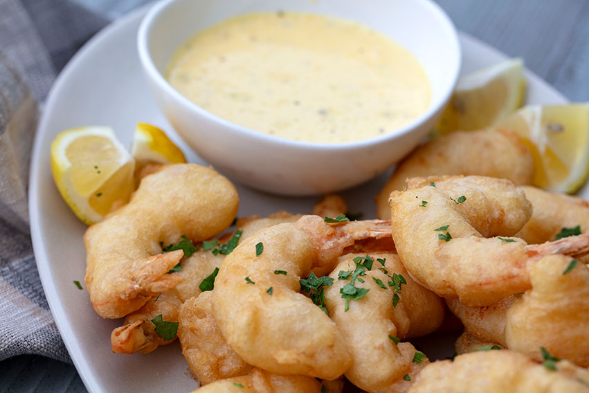 Crisp, lightly battered shrimp are served with a vibrant lemon dip.