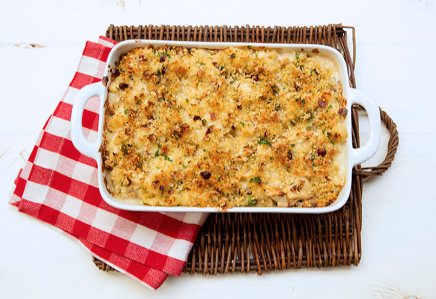 This pasta dish combines an entire head of roasted cauliflower, some tasty bacon bits, and pasta shells in a creamy, cheesy sauce that is topped with a crumb mixture flavored with even more grated cheese along with some chopped hazelnuts. The roasted cauliflower adds a subtle earthiness to the pasta that is delicious, but since the cauliflower is almost indistinguishable from the pasta once baked, it is an excellent way to encourage children to eat cauliflower without even realizing that they are doing so.