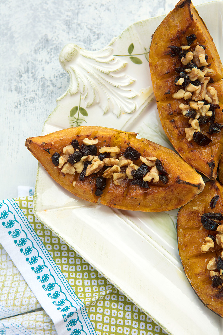 I’ll be honest with you, I intended to use dried cranberries, but having just returned from six months in Italy, my pantry apparently was lacking in cranberries, so I used what was there, and that was dried sour cherries. The cherries complemented the sweetness of the squash nicely, and the walnuts added some great texture, but feel free to use cranberries instead of the cherries, and pecans in place of the walnuts if you prefer. Like any good holiday side dish, this squash dish can be prepared ahead of time and be served at room temperature.