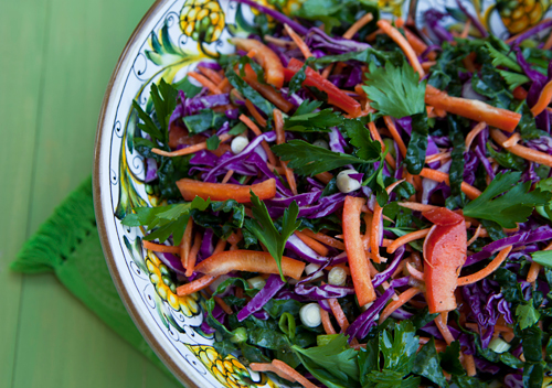 I have been experimenting with different raw vegetable salads recently, trying out new combinations of vegetables of every description in order to create great texture and flavor. We love kale prepared any way possible, so it wasn’t a great leap to imagine kale would be great in a salad.