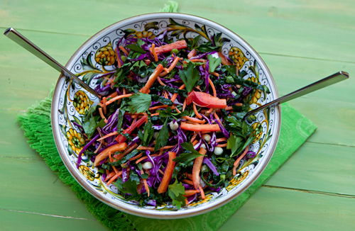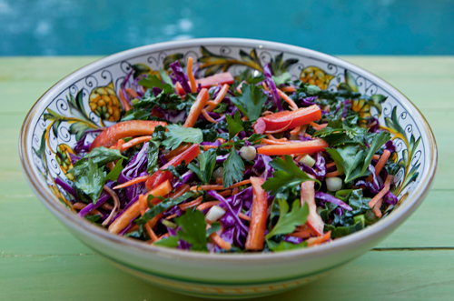 Because kale leaves are somewhat tough, I found it best to slice the kale thinly as you would cabbage in a cole slaw. I also found that Tuscan kale, or dinosaur kale works best in this salad as it is more tender and has a little sweeter flavor than the curly variety. Because I like my salads colorful, I added red cabbage, julienned carrots and red peppers, green onions, and fresh herbs.