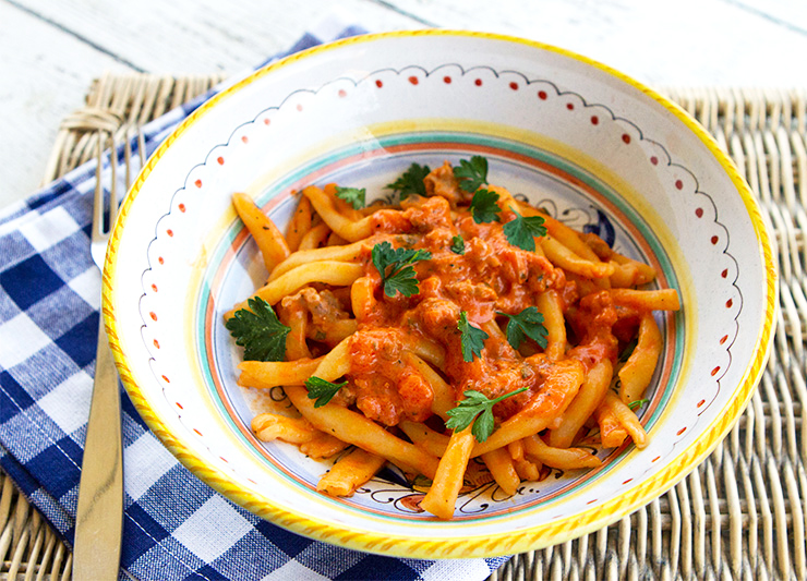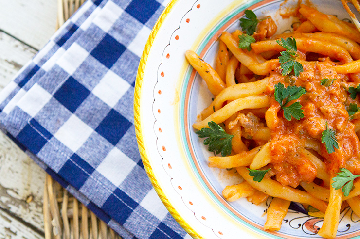 This sauce was created recently when I made some homemade strozzapreti and wanted an easy, chunky sauce. I pulled some Umbrian sausage links from the freezer in the morning and pulled this sauce together just before I cooked my pasta.