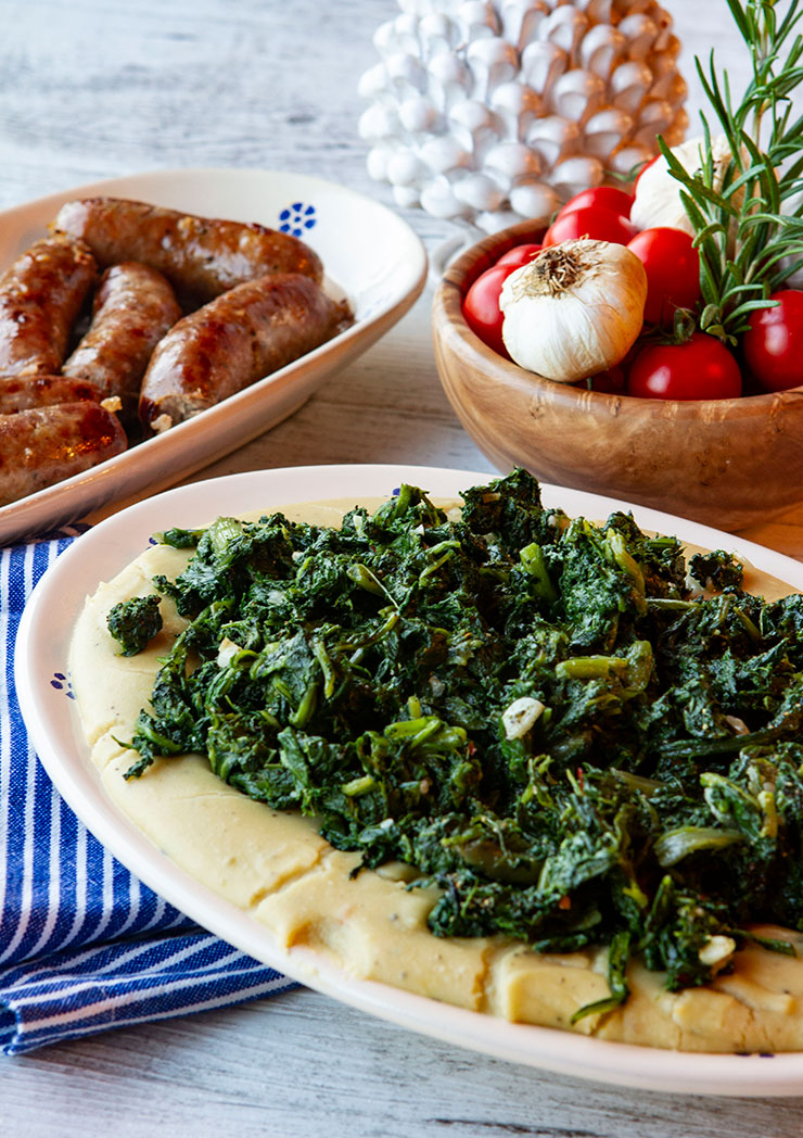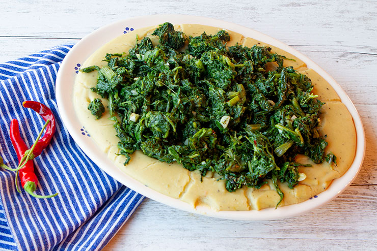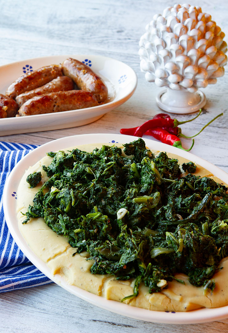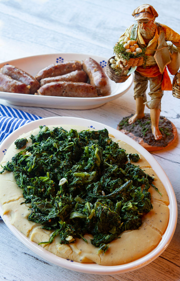 - Serve a scoop of fava puree on each plate topped with a spoonful of the sautéed chicory.