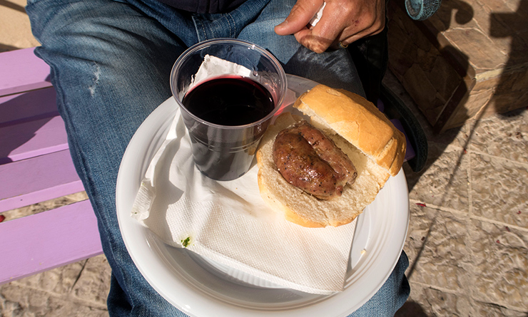 Breakfast of champions. A sausage panini and glass of red.