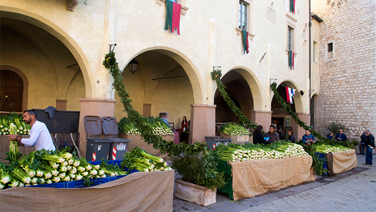Selling black celery in the main piazza of Trevi.