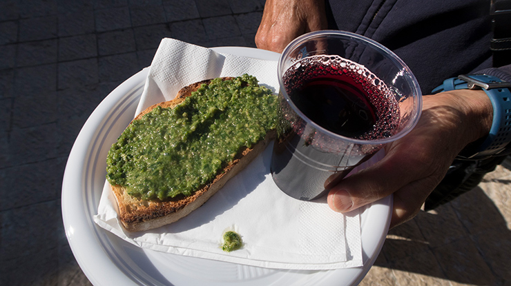 Bruschetta with black celery pesto and a glass of red to wash it down.