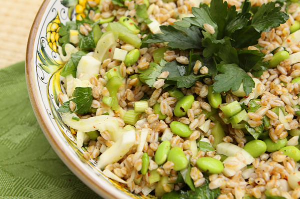 We eat a variety of healthy grains in our home, but one of our favorites is an ancient grain I discovered while we were living in Umbria called farro. I use farro in my soups, in place of rice in risotto, as well as in a variety of salads such as this one made with fennel, celery, and edamame.