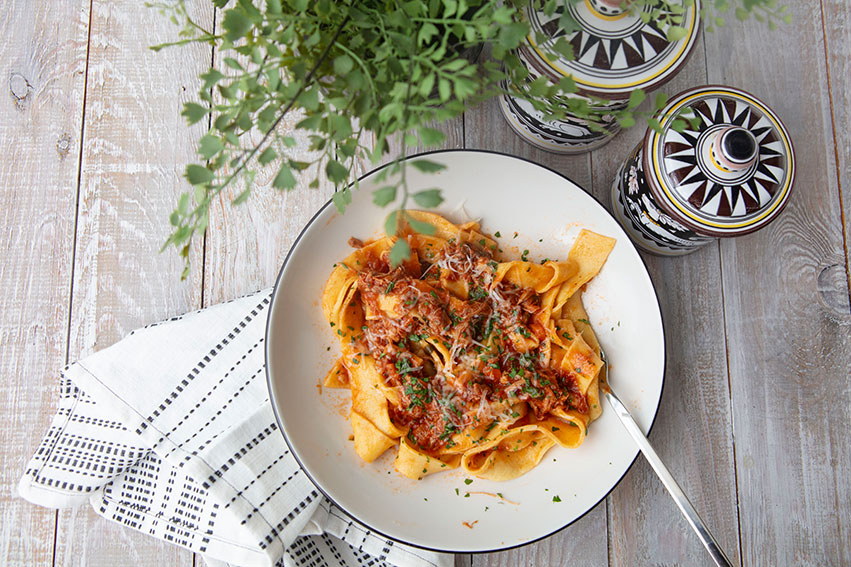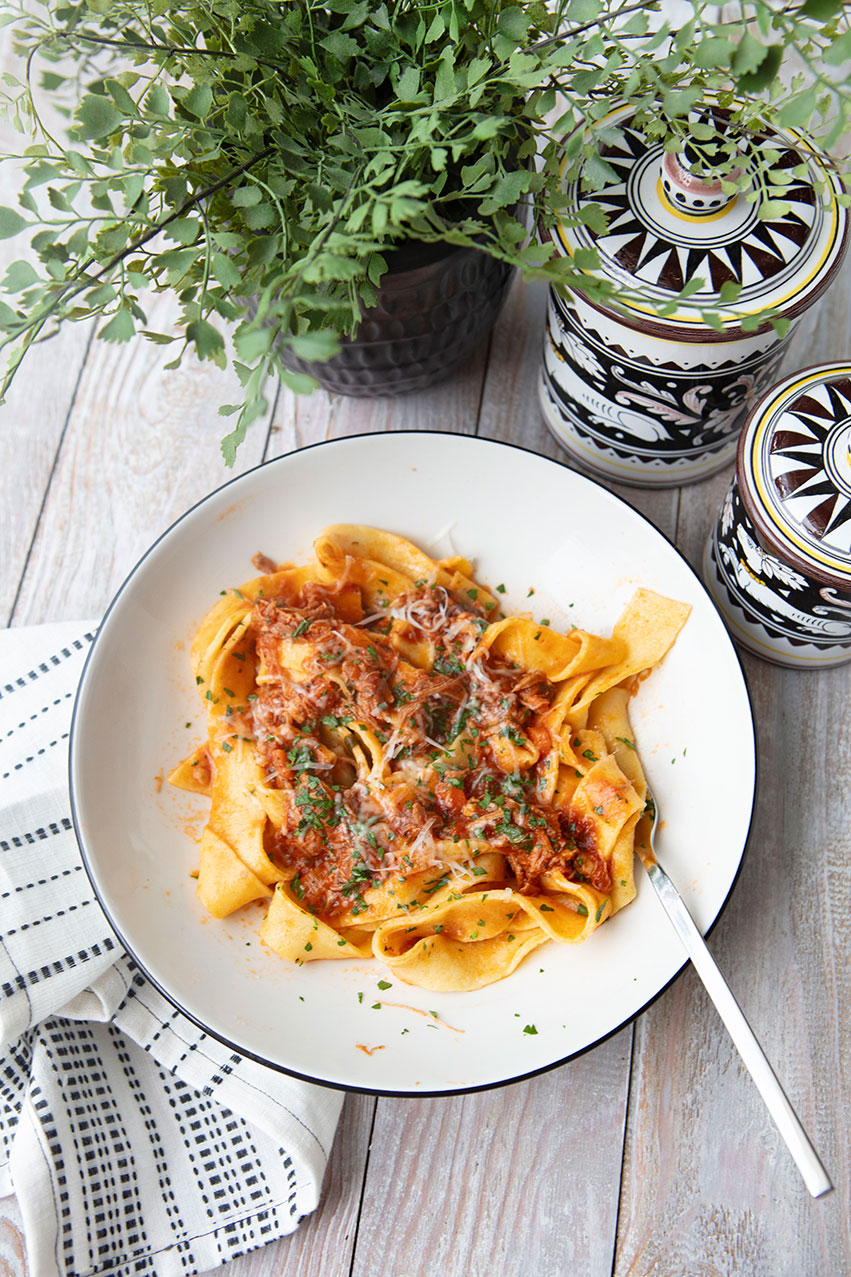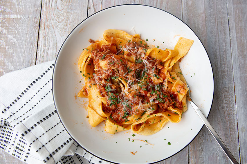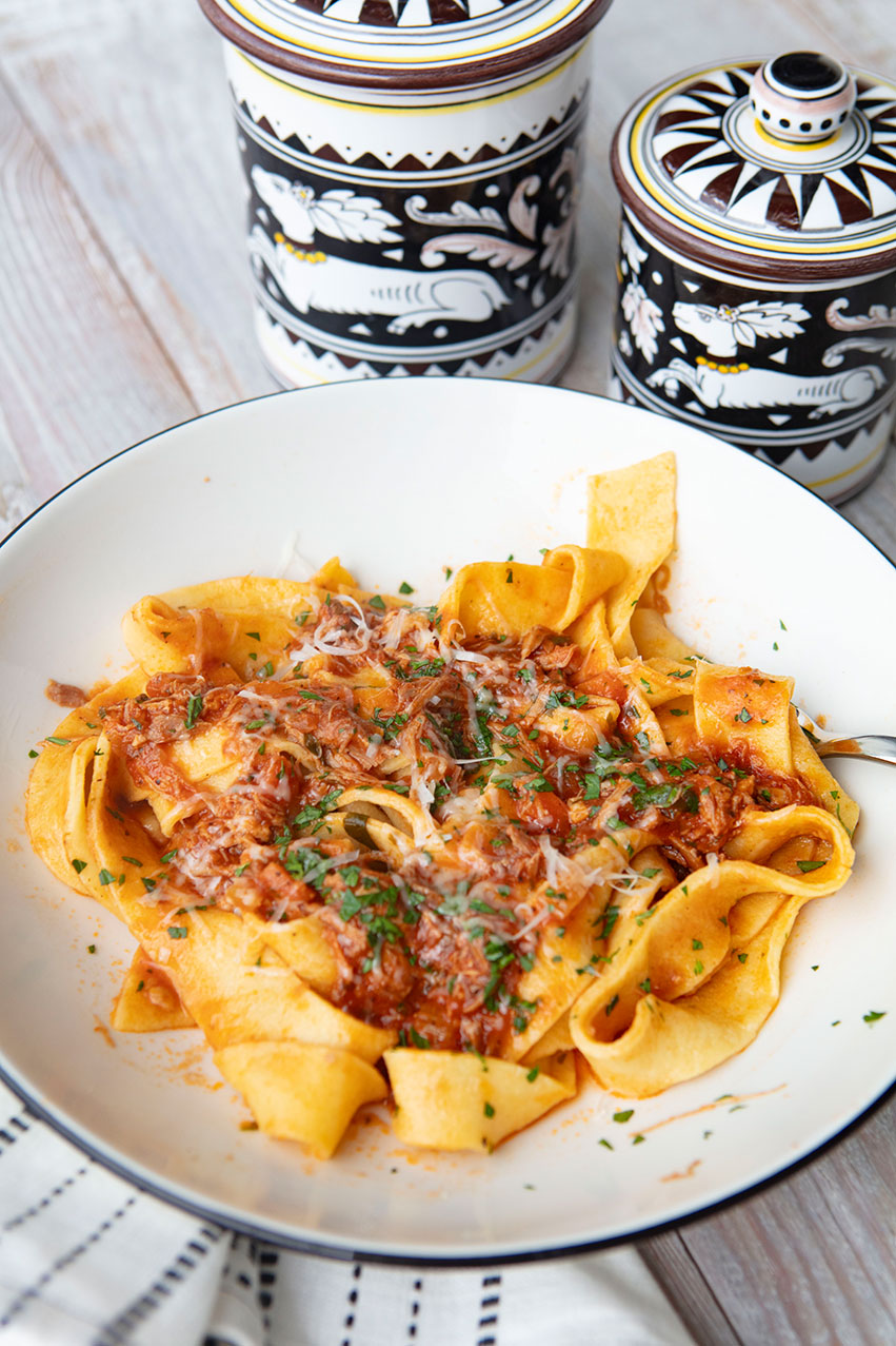 This special pasta is a Venetian specialty, made with duck legs, and the tomato sauce is flavored with cinnamon, orange, and white wine. Pappardelle is a typical pasta to serve with this ragu, but any pasta shape would work just fine. If you are making your own pappardelle, simply roll out your pasta dough thinly, then cut it into one-inch thick strips.