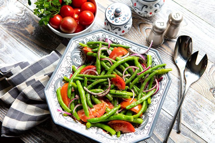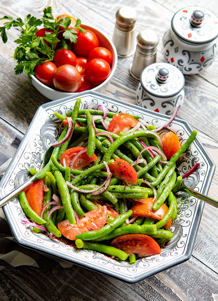 This dish pairs really well with any grilled meat, fish or poultry. You can also enjoy it on its own for a light lunch topped with a ball of fresh mozzarella, which is how my husband and I like to eat it. The trick to making this dish work is to blanch the beans just until tender-crisp, then place them in an ice-water bath to stop the cooking process. Add chunks of ripe tomatoes, thin slices of red onions, then toss everything in a vibrant dressing, and you have a fantastic summer side.
