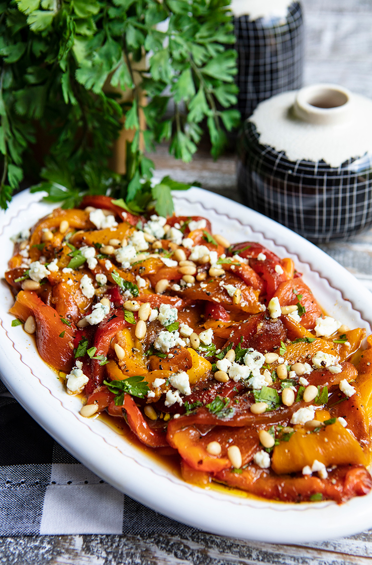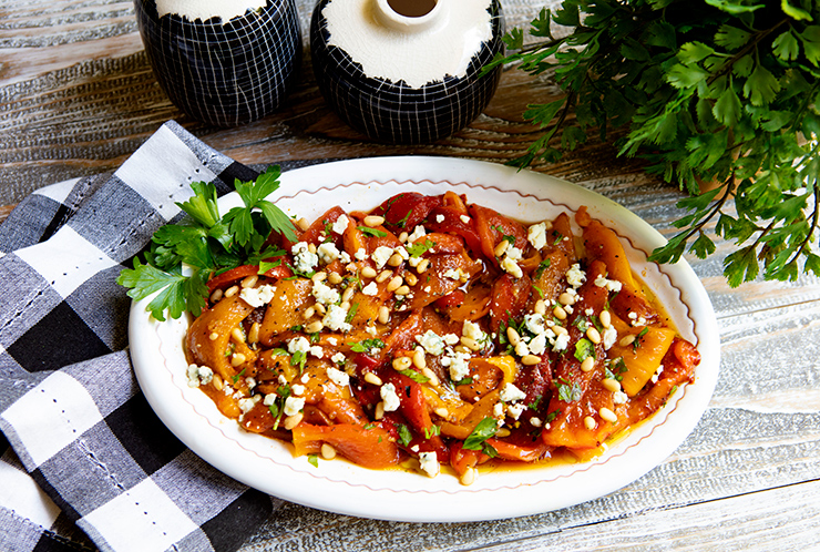 Grilled peppers are topped with cheese crumbles and pine nuts in this easy summer side dish.