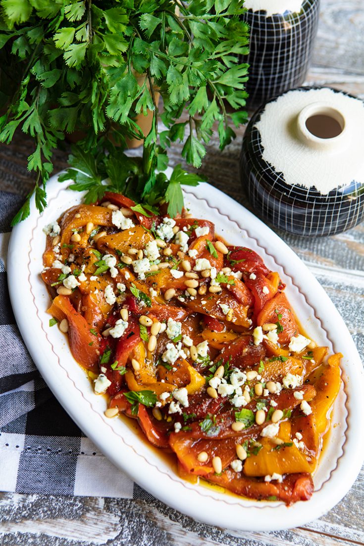 - Place the peppers in a bowl, and toss with the olive oil, vinegar, garlic, salt, pepper, and parsley.