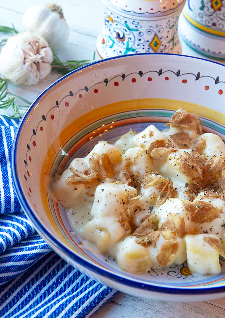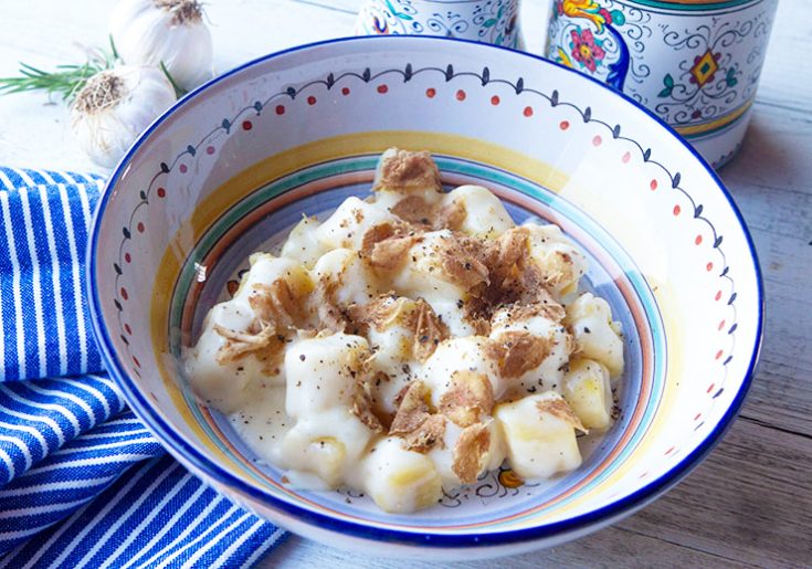 Light, pillowy potato gnocchi is topped with a truffle flavored cheese sauce in this Umbrian recipe.
