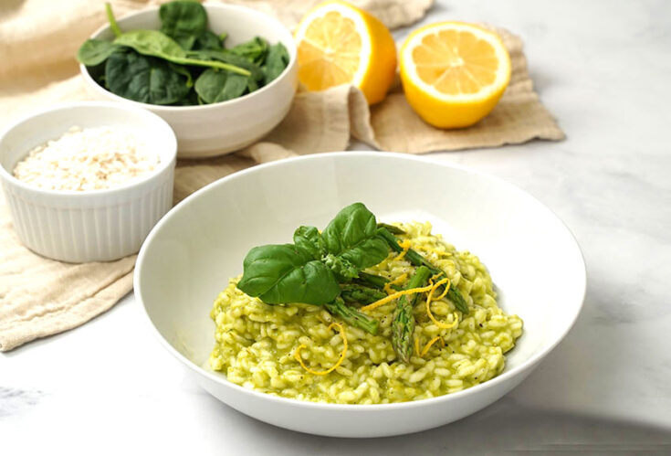 A creamy risotto dish with a vibrant green color and flavor for spring.
